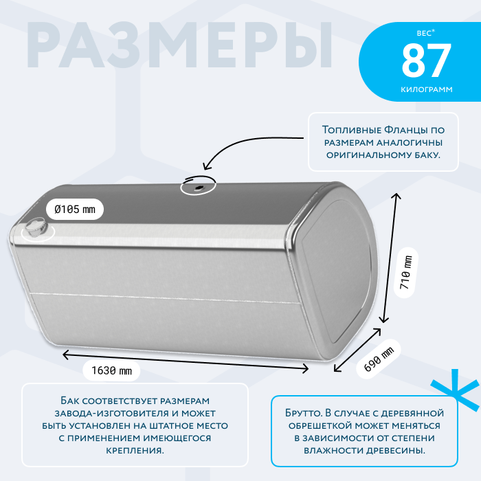- Так же, если вы приобретаете алюминиевый топливный бак, он будет в деревянной обрешетке (для усиления защиты при транспортировке). При просчете веса и объема, цена за доставку может измениться по факту взвешивания на самом терминале транспортной компании. Так как деревянная обрешетка соответственно изготовлена из древесины, и она имеет свойство значительно набирать вес в зависимости от влажности окружающей среды.